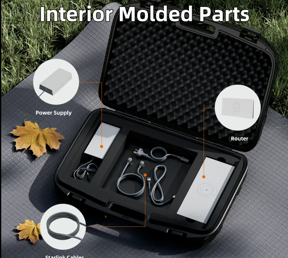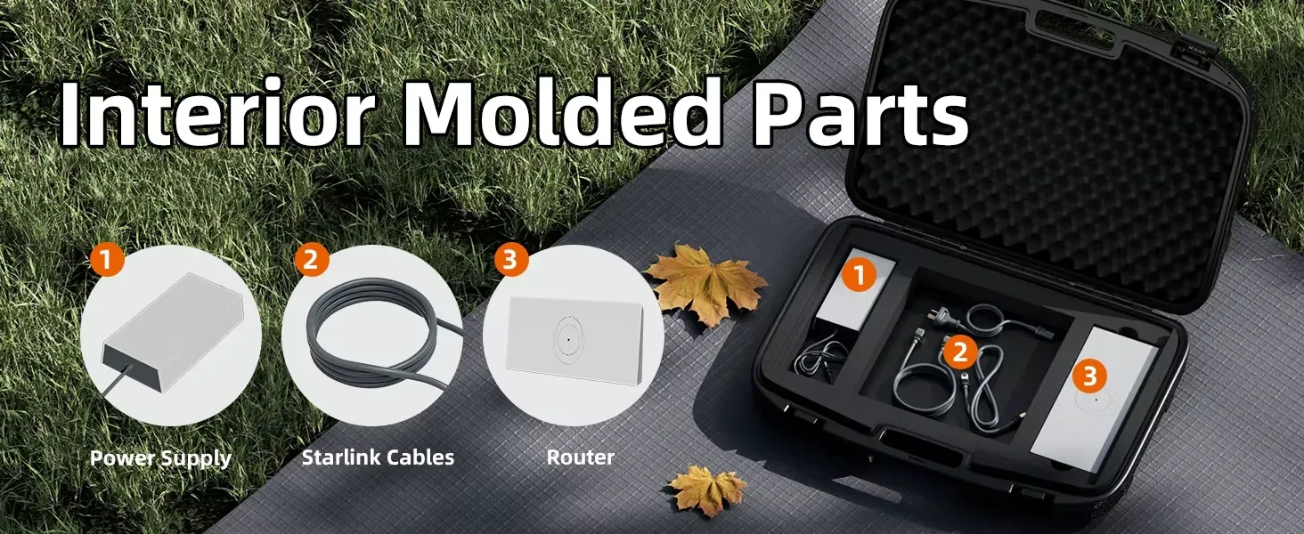 Чехол Starlink Gen 3 из ударопрочного полипропилена водонепроницаем, защищает от пыли, дождя и ударов. Внутри — антивибрационная губка и мягкая прозрачная прокладка, фиксирующие устройства и защищающие от царапин. Для антенны, кабелей, роутера и блока питания — отдельные ячейки, упрощающие организацию и ускоряющие настройку.